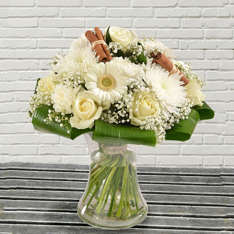 A Stunning handtied bouquet in whites and greens, the perfect Winter and Festive gift.(subject to seasonal availability)