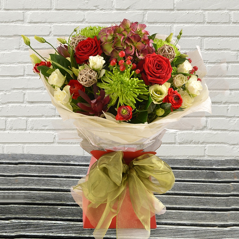 A handtied seasonal gift including red, white and green flowers and foliage.(subject to seasonal availability)