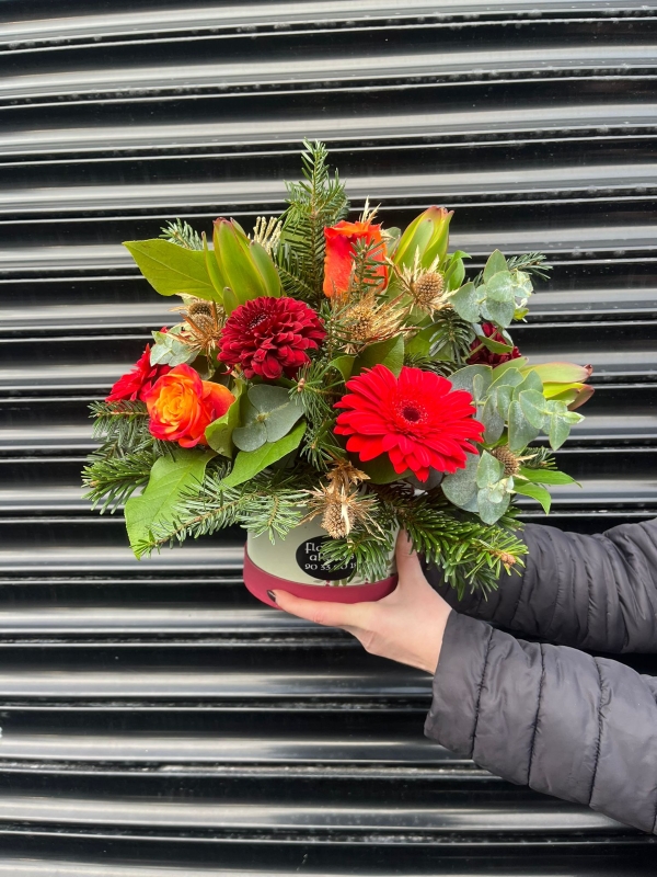 A seasonal hatbox arrangement, this will include the freshest florals daily chosen by our florist.